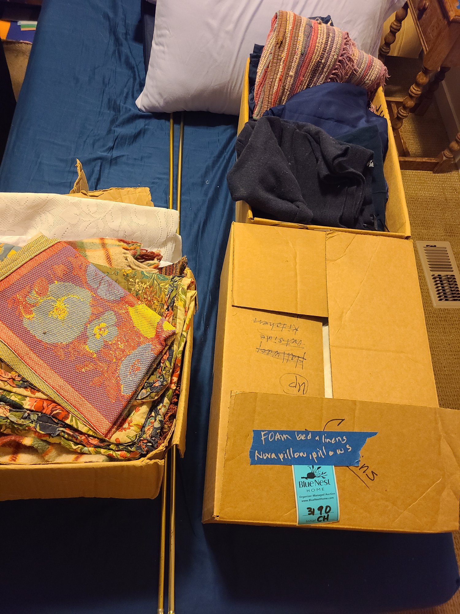 Foam bed on base measures 38in x 17in x 72in. Linens include sheets, blankets, quilt and pillows. Various size curtains and rod. Nova bed pillow. Bring packing material. Needs cleaning. Not checked for completeness. Bring the appropriate vehicle to remove.