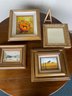 Four Small To Medium Pieces Of Artwork And A Gold Color Framed Mirror With Stand