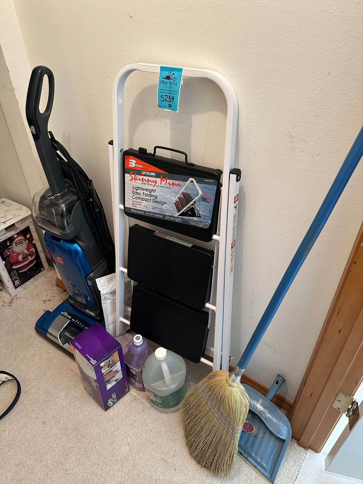 Hoover Vacuum, Step Ladder, Broom And Dustpan. Items have not been tested or checked for completeness. Expiration dates on cleaning supplies have not been checked. You must bring appropriate vehicle and your own packing materials to remove.