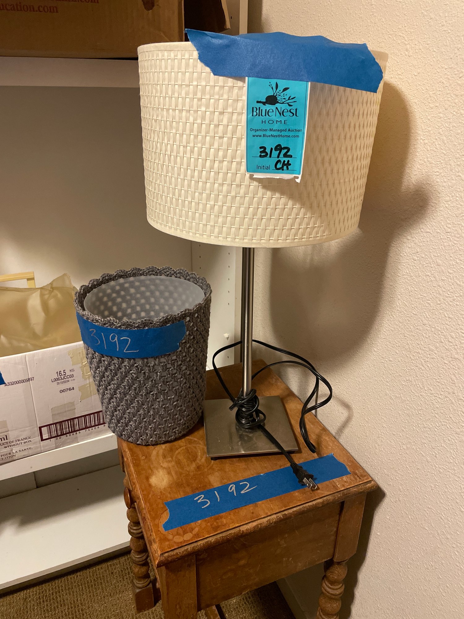 Lamp with shade measures 23in tall. The side table measures 15in x 13in x 25in. Needs refinishing and cleaning. The lot includes a wastebasket with plastic lining. Bring packing material. Not checked for completeness and untested.