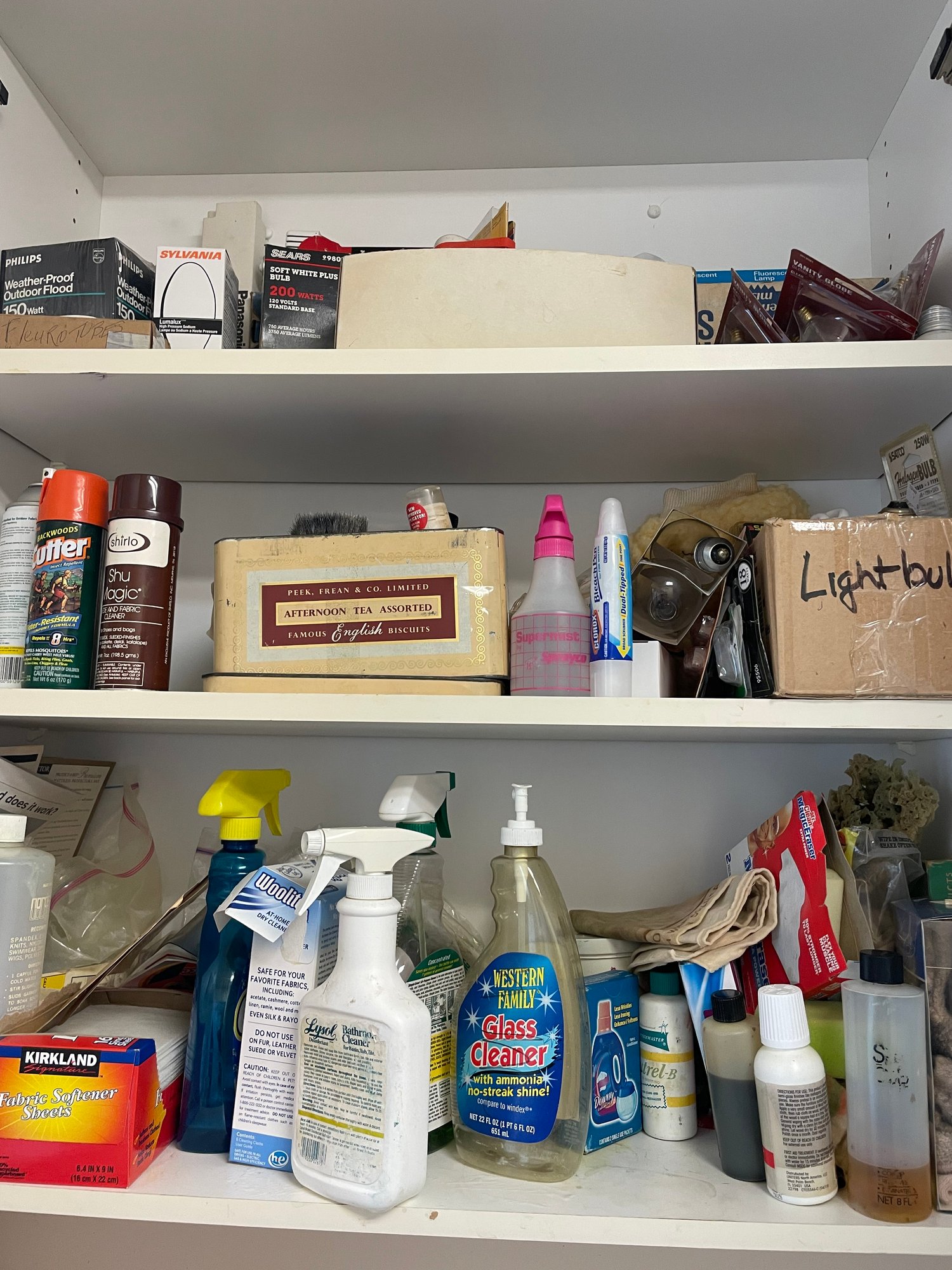 Laundry Room Supplies Including Used Cleaning Supplies And Lightbulbs