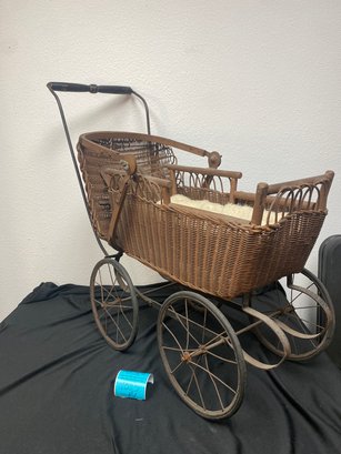 Wicker and metal antique doll carriage/ stroller / pram. 24 inches long x 26 inches high x 13 inches deep.