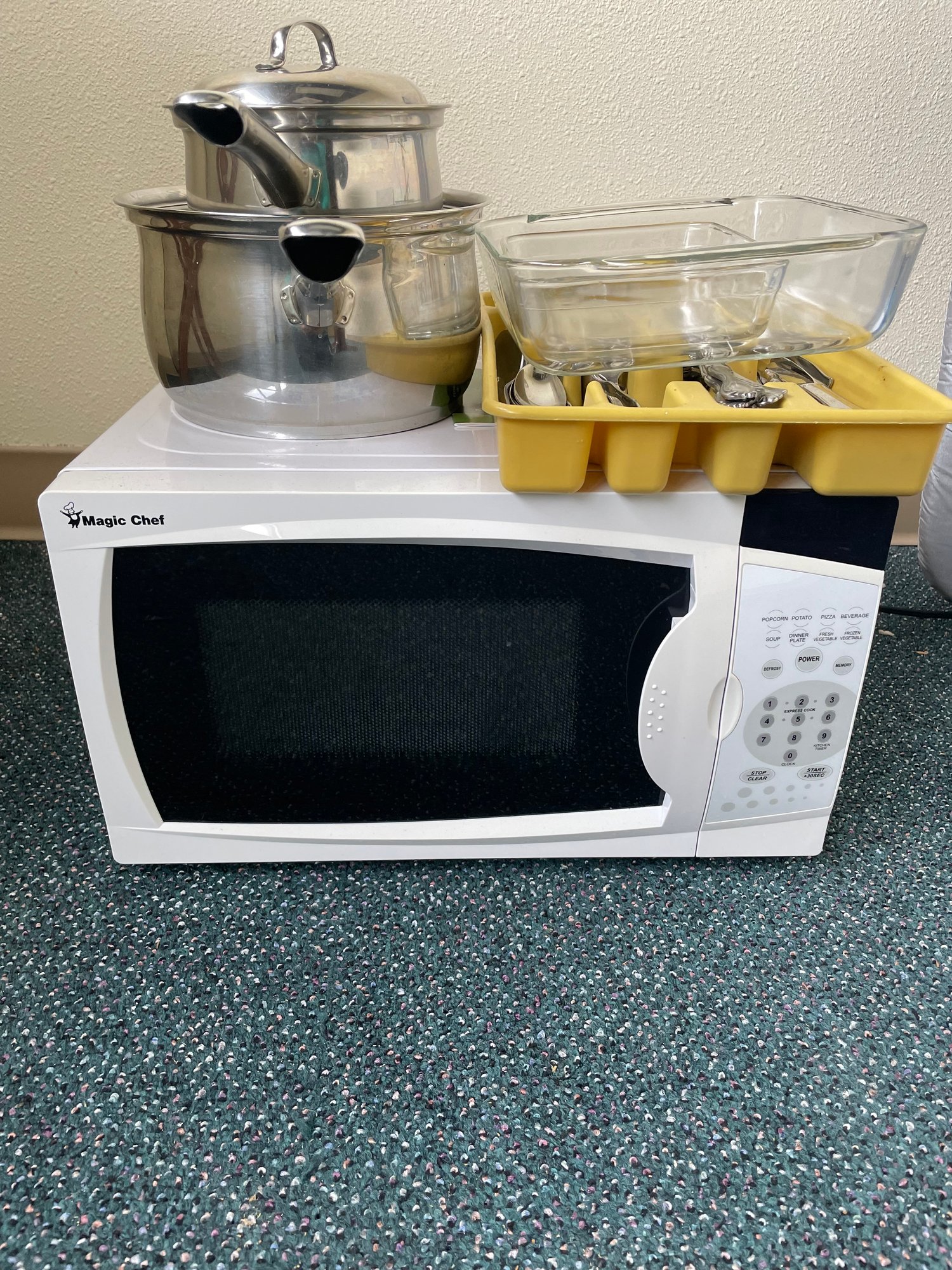 Magic Chef Microwave, Two Belgique Pots, Cutlery In Organizer And Two Pyrex Glass Baking Pans.