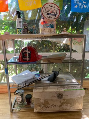 Metal shelf, colored depression glass container with lid, Assorted items in cabinet drawers, cleaning supplies, paper plates, stackable bowls, colorful banner. Wooden cabinet NOT included! Metal shelf measures 25 in tall x 25 in x 1 ft