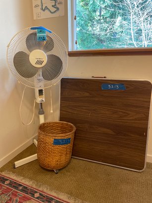 Oscillating fan. 62in folding card table. Basket measures 13in tall. Bring packing material, untested.