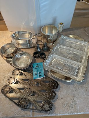 Possible Silver Bowls, Platters, Decanter, Salt And Pepper Shakers. Not checked for authenticity.