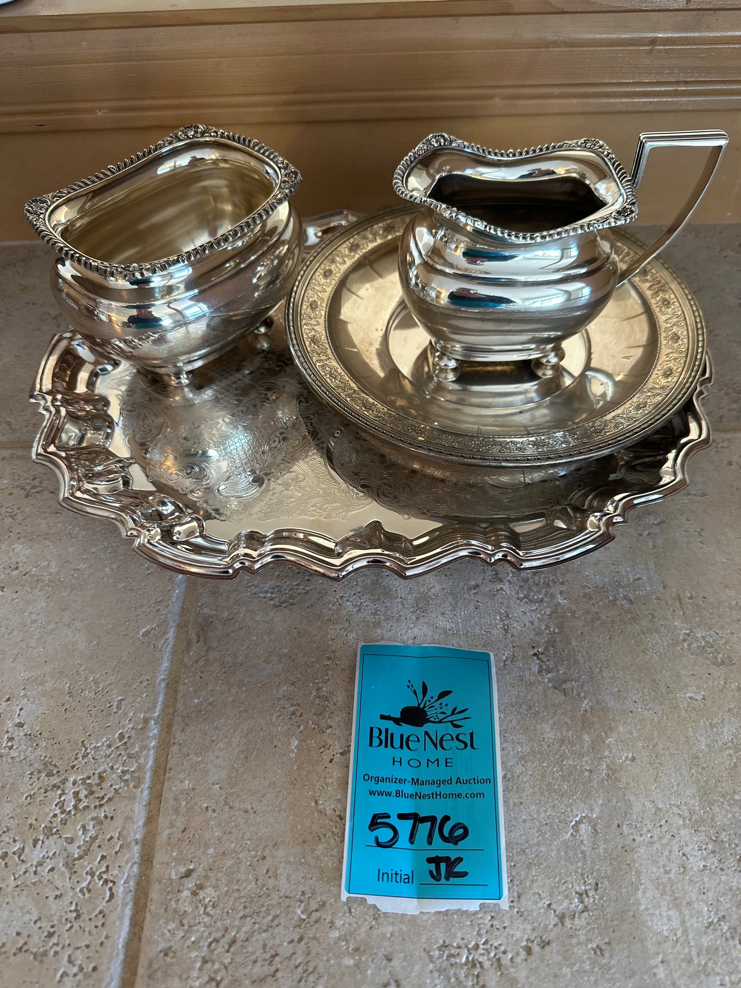 Possible Silver Sugar Bowl and creamer. Stamped sterling plate that measures 9in. Possible silver platter that measures 14in. Not checked for completeness.