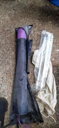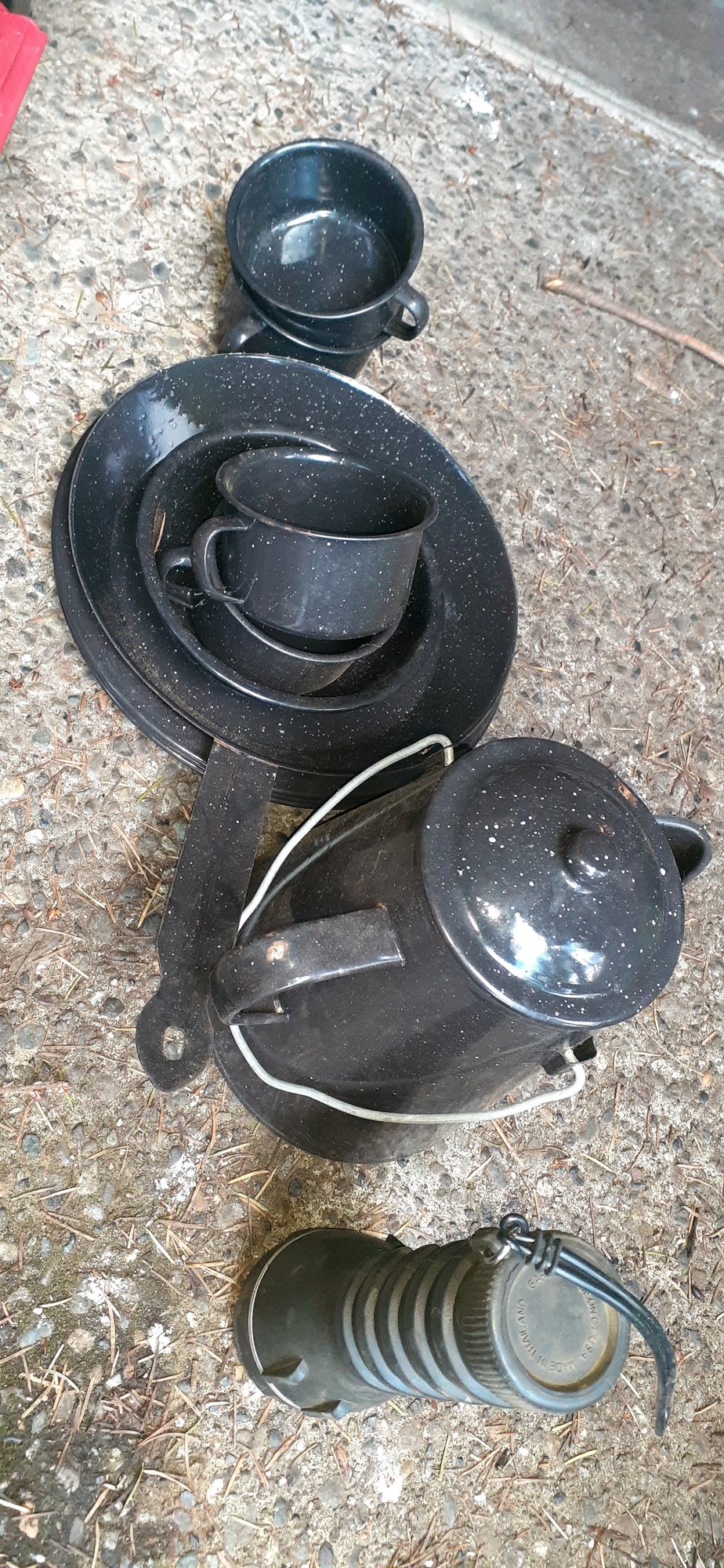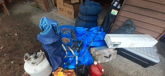 Includes propane tank, pots, kettle, charcoal, firewood + fire grate
