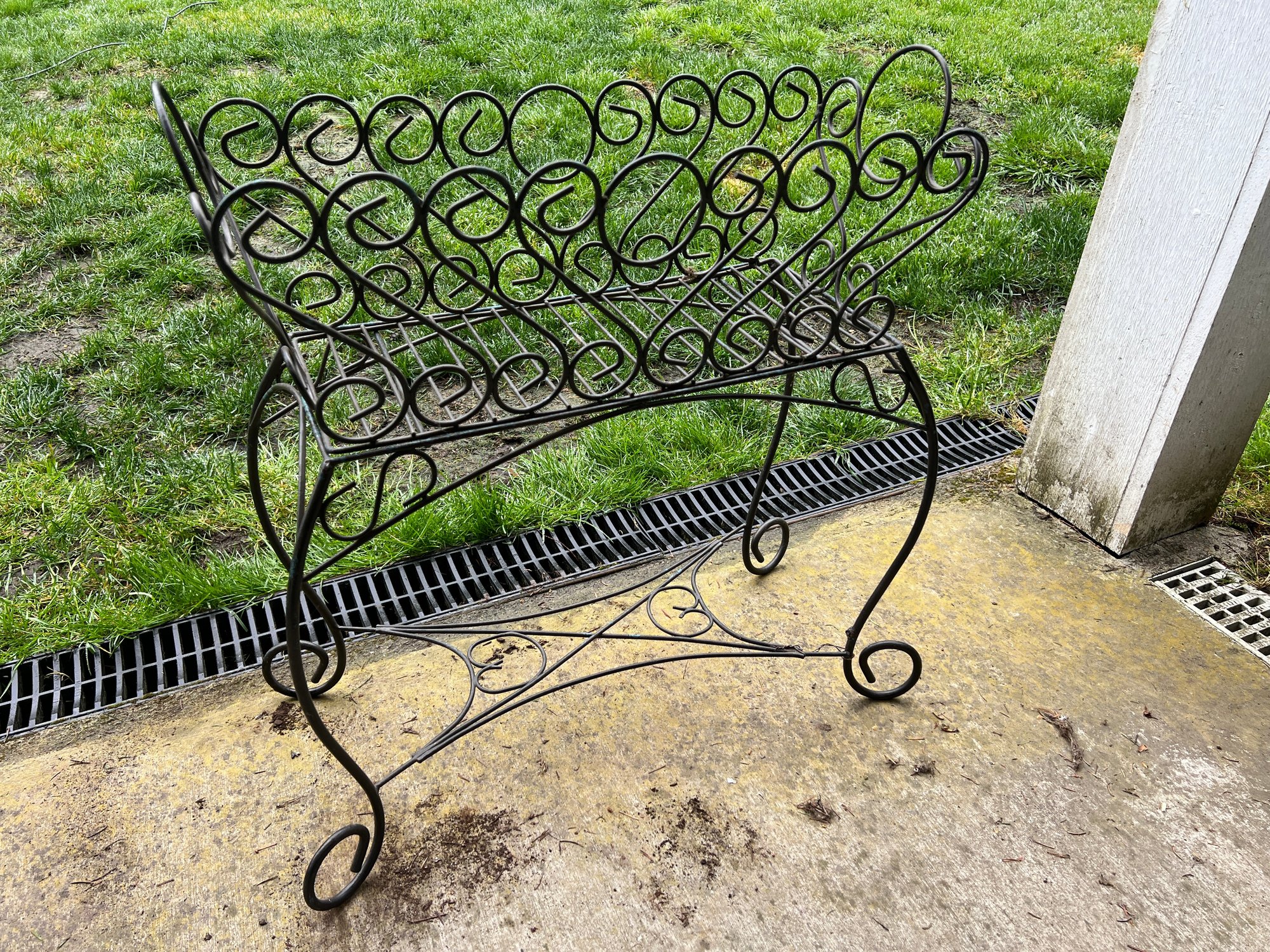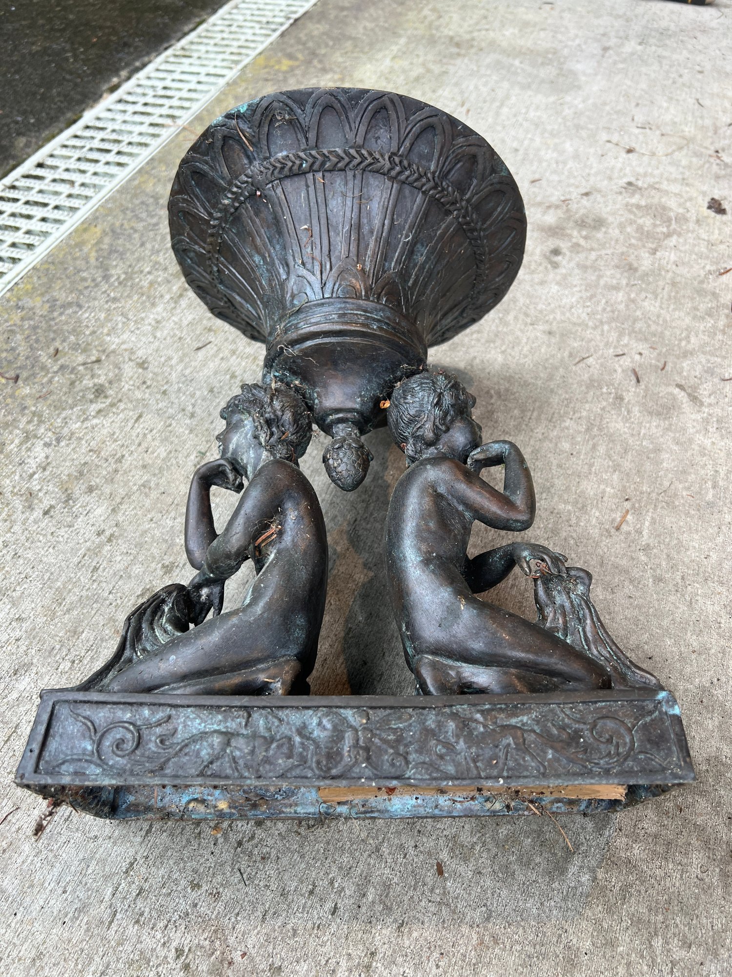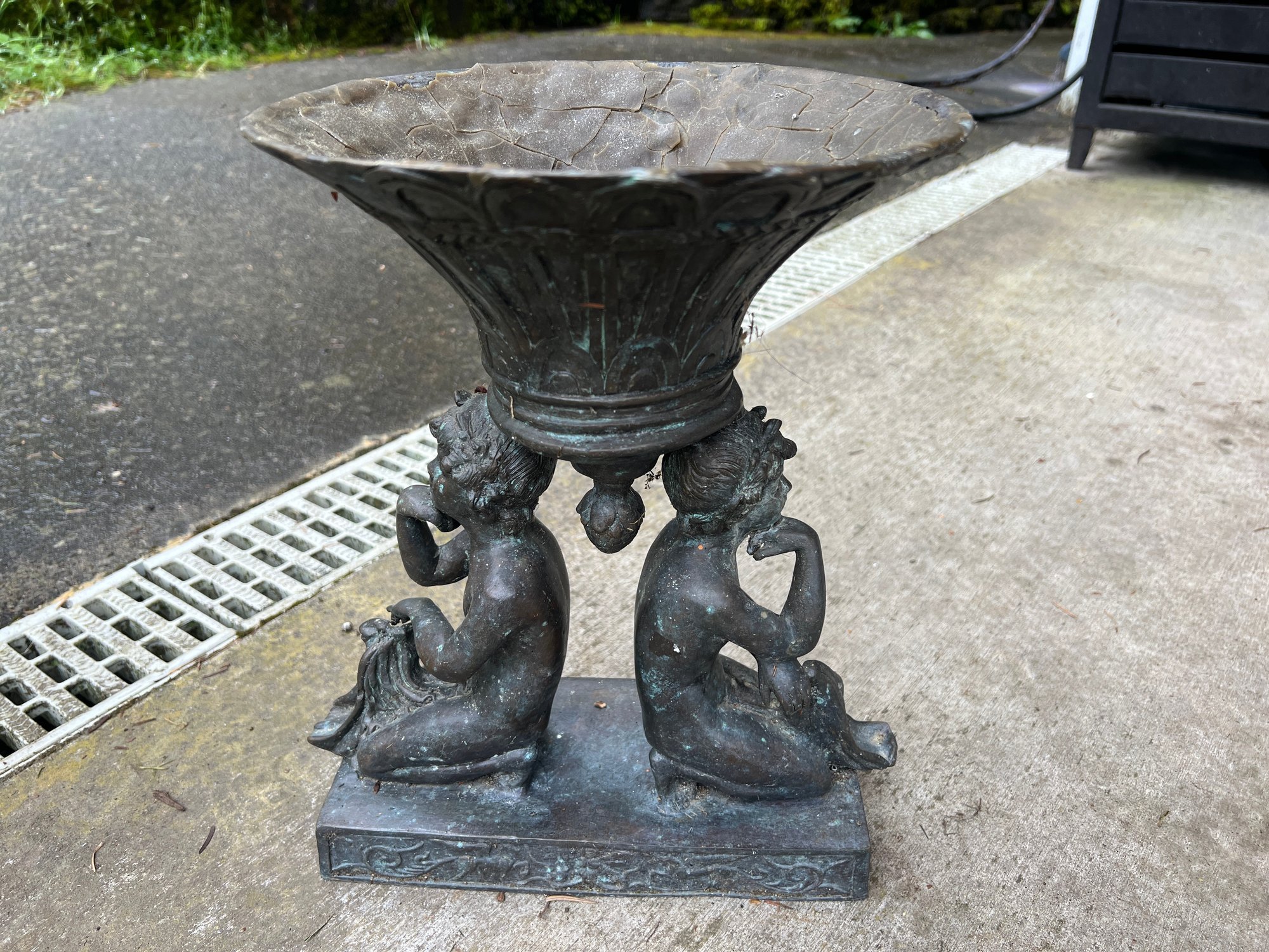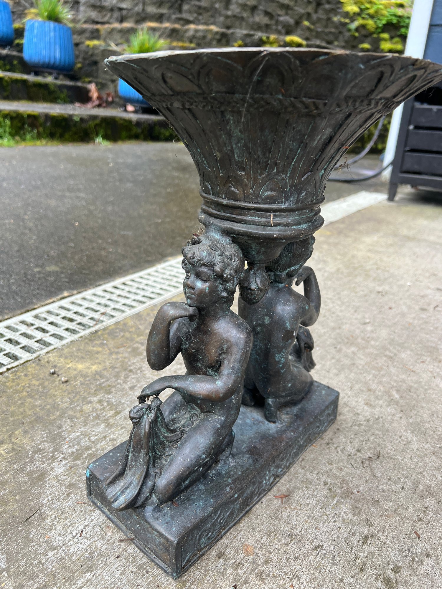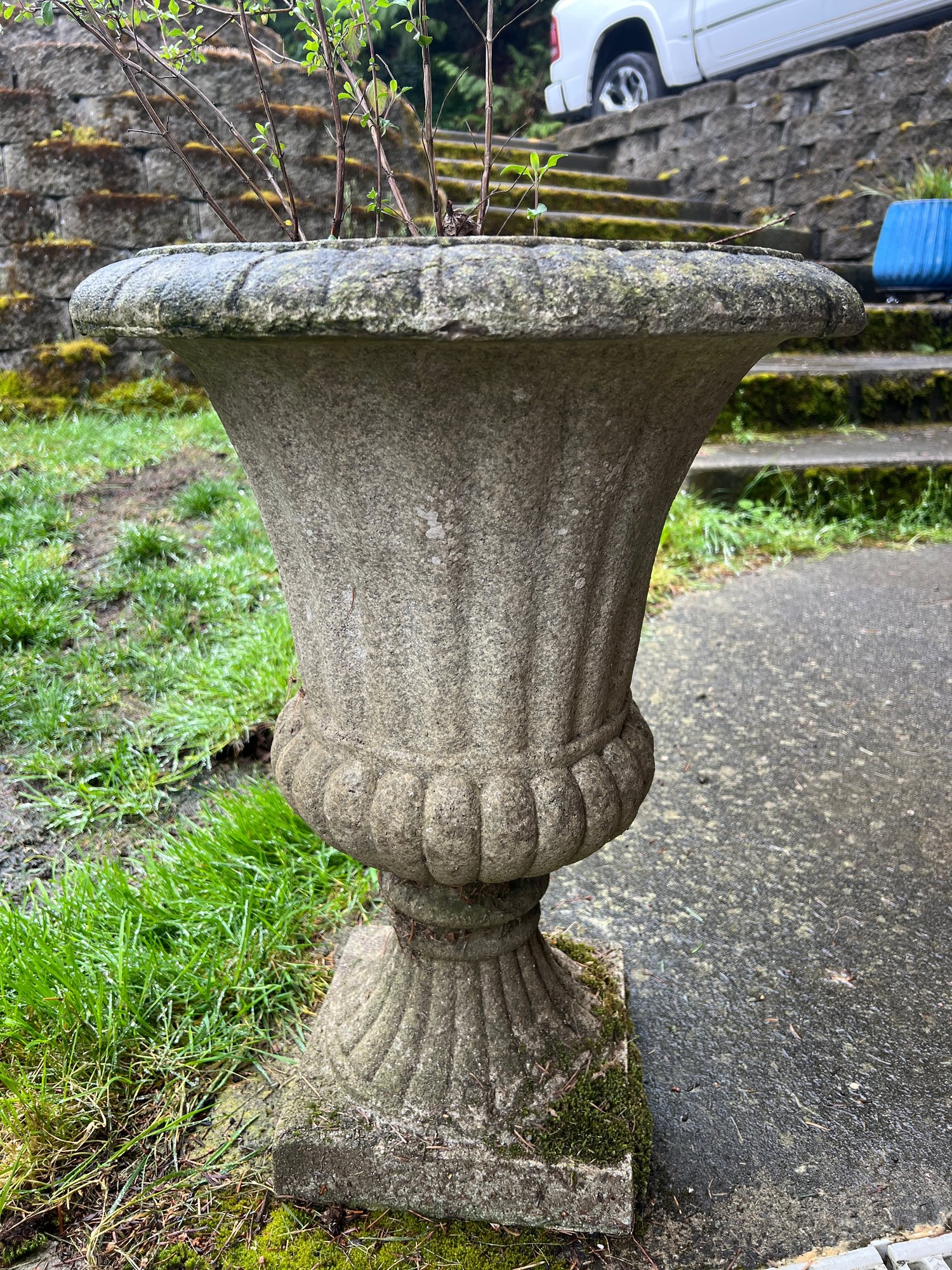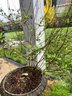 R0 Metal Plant Stand 27x26x11 inches , Tall Plastic Urn Style Planter with plants 27in tall 23in wide And Metal Sculpture Deco 14in tall 11 inches at base and 9.5 at top
