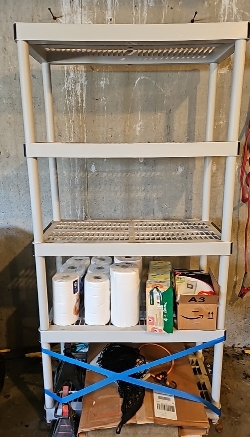 R0 Plastic Shelving unit with Five Shelves and one shelf Full of items