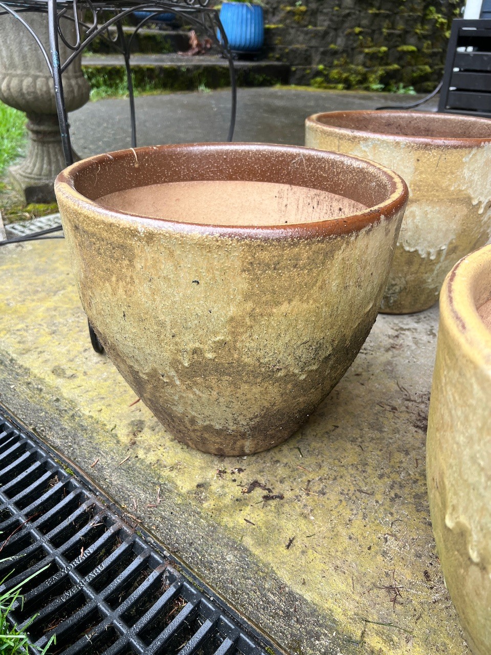 R0 Three Large Heavy Clay Pots 12in Tall 14in Diameter