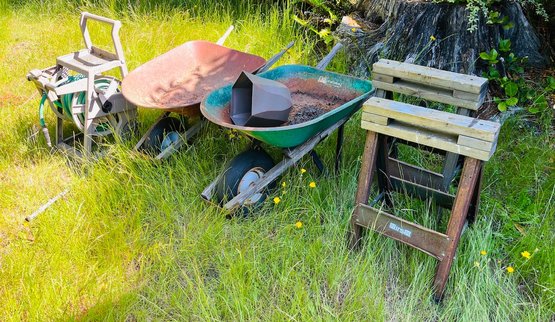 R00 Outdoor Items Garden Hose Reel, Sawhorses, Wheelbarrows