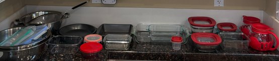 R1 Cooking and Bakingware lot to include glass ware such as Pyrex, with some Rubbermaid lids, mixing bowls, strainer, pop corn kettle and more! Bring your own packing materials