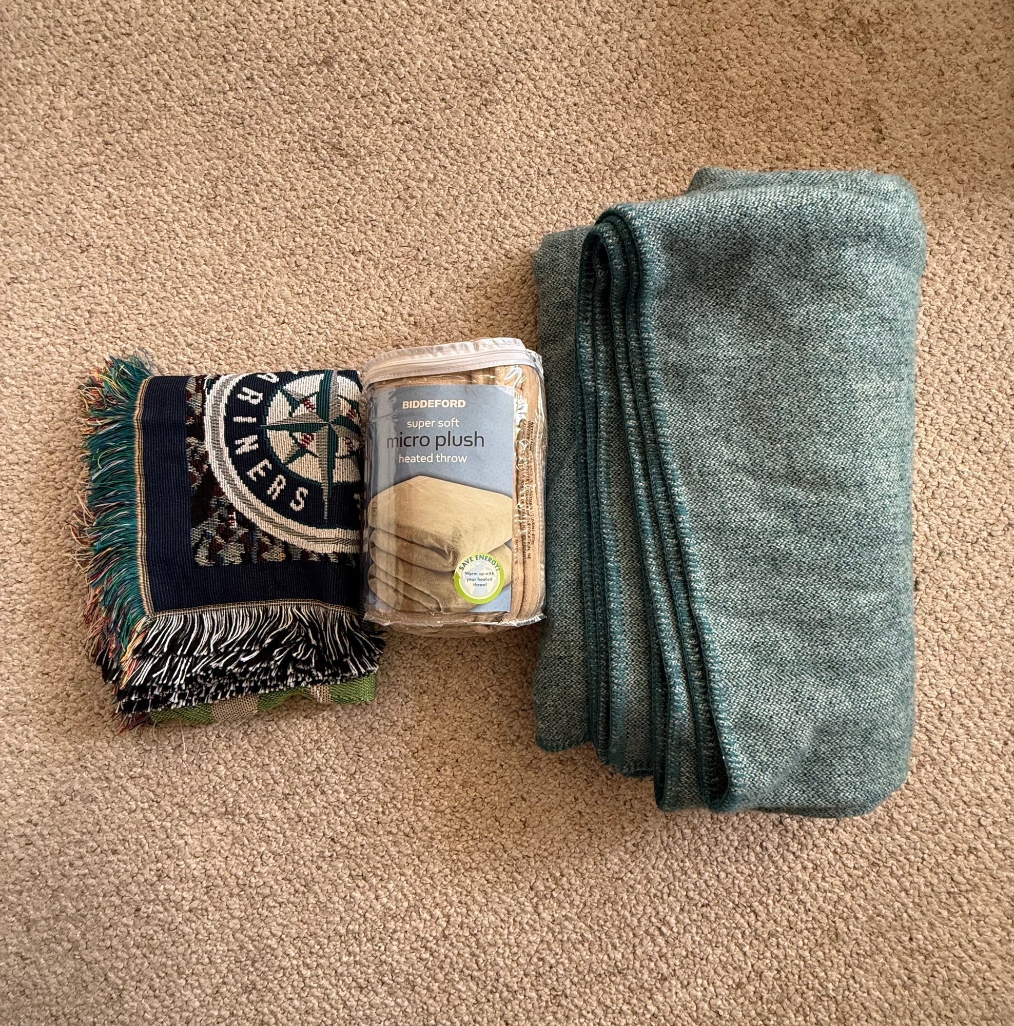 R1 Lot of, King Size Teal Woolen Blanket, Heated Throw, And 4x5' Seattle Mariners Throw
