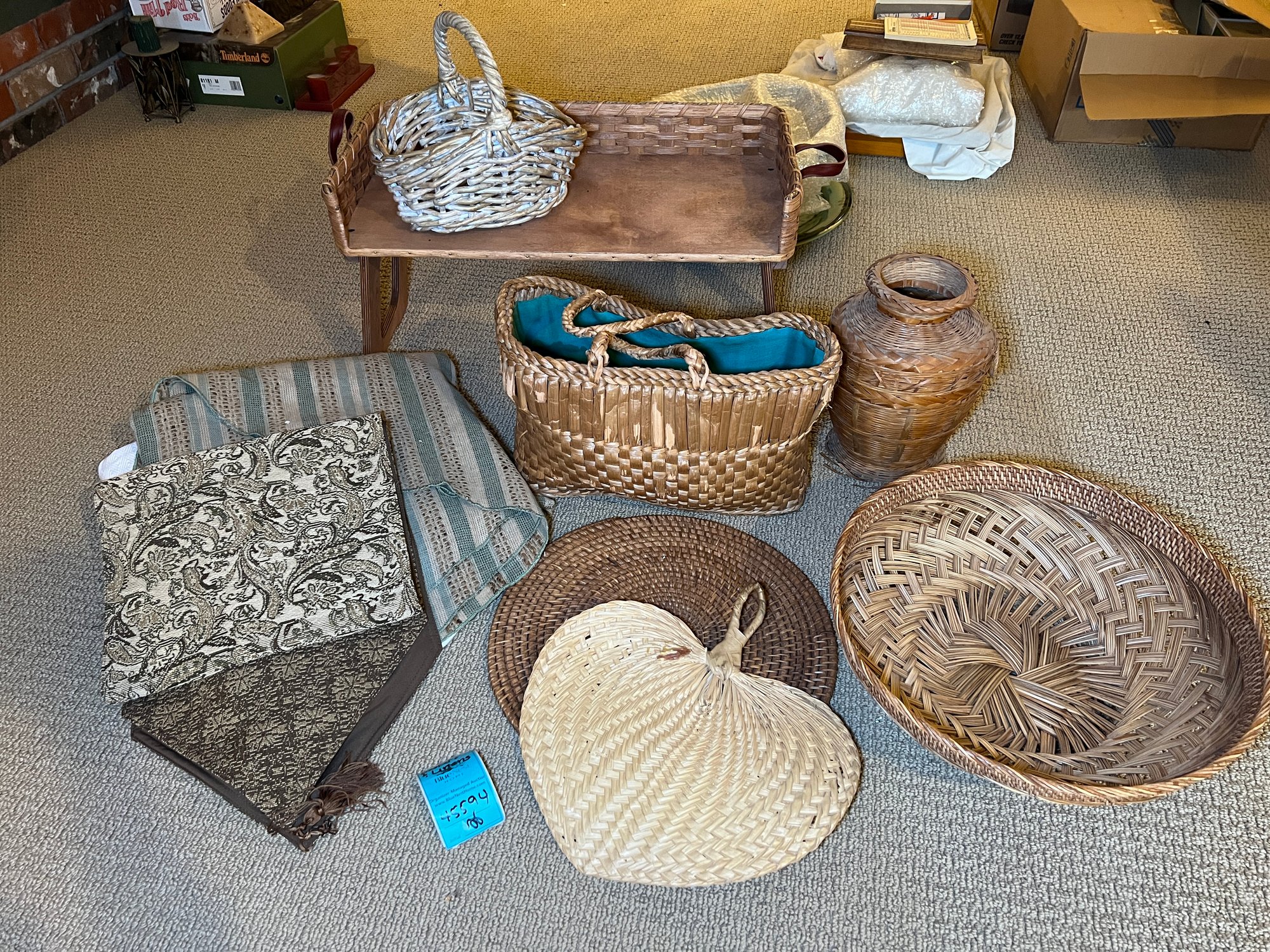 R11 Baskets, Rattan Pieces, Lap Desk With Folding Legs, Table Cloth And Protector approx 70” round, Table Runner approx 64in long. Please see photos for more details