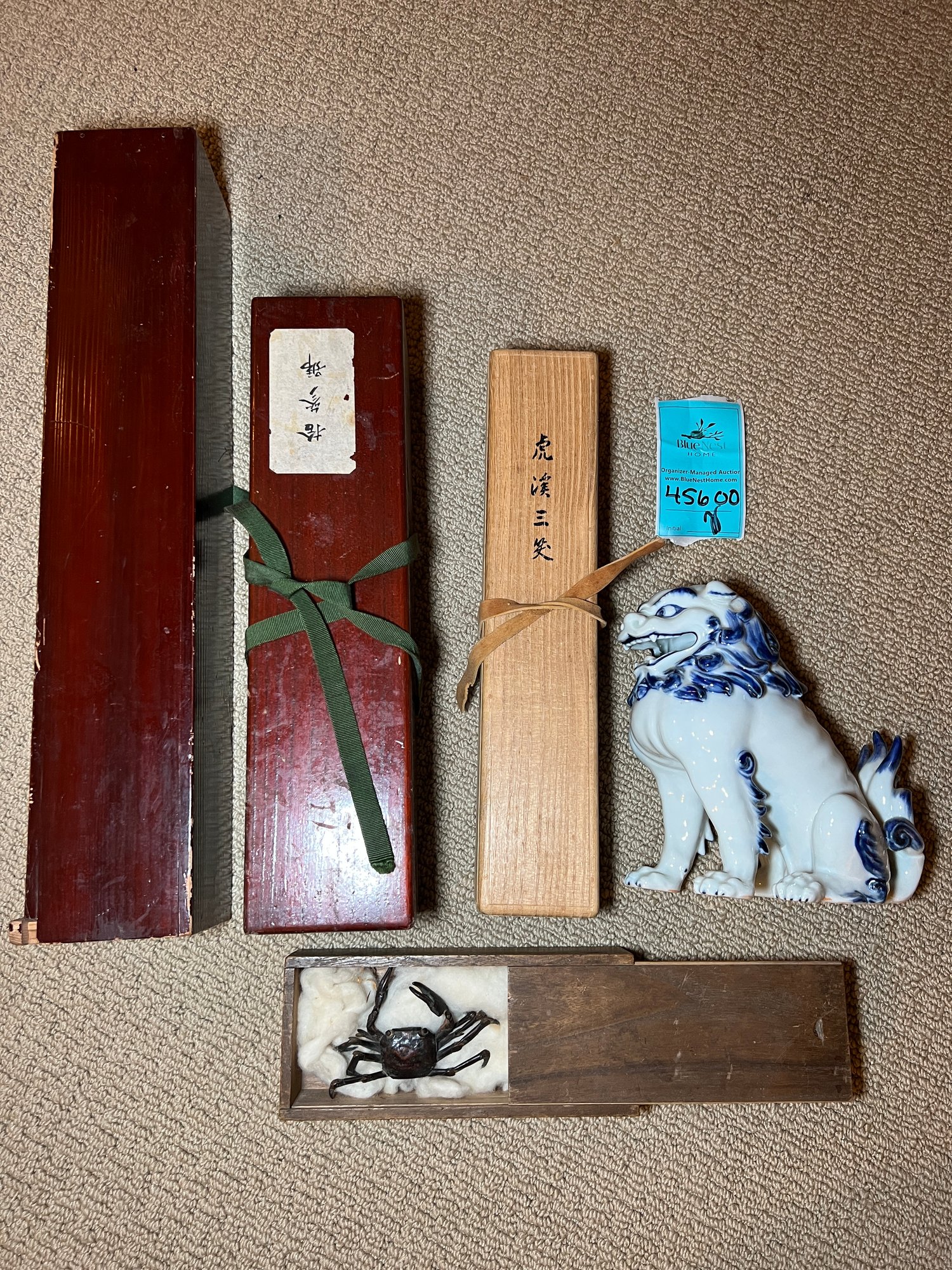 R11 Empty Japanese Wood Scroll Boxes, Box With Metal Jointed Crab And Porcelain Shisa Lion Owner states bought in Japan during 1948/49
