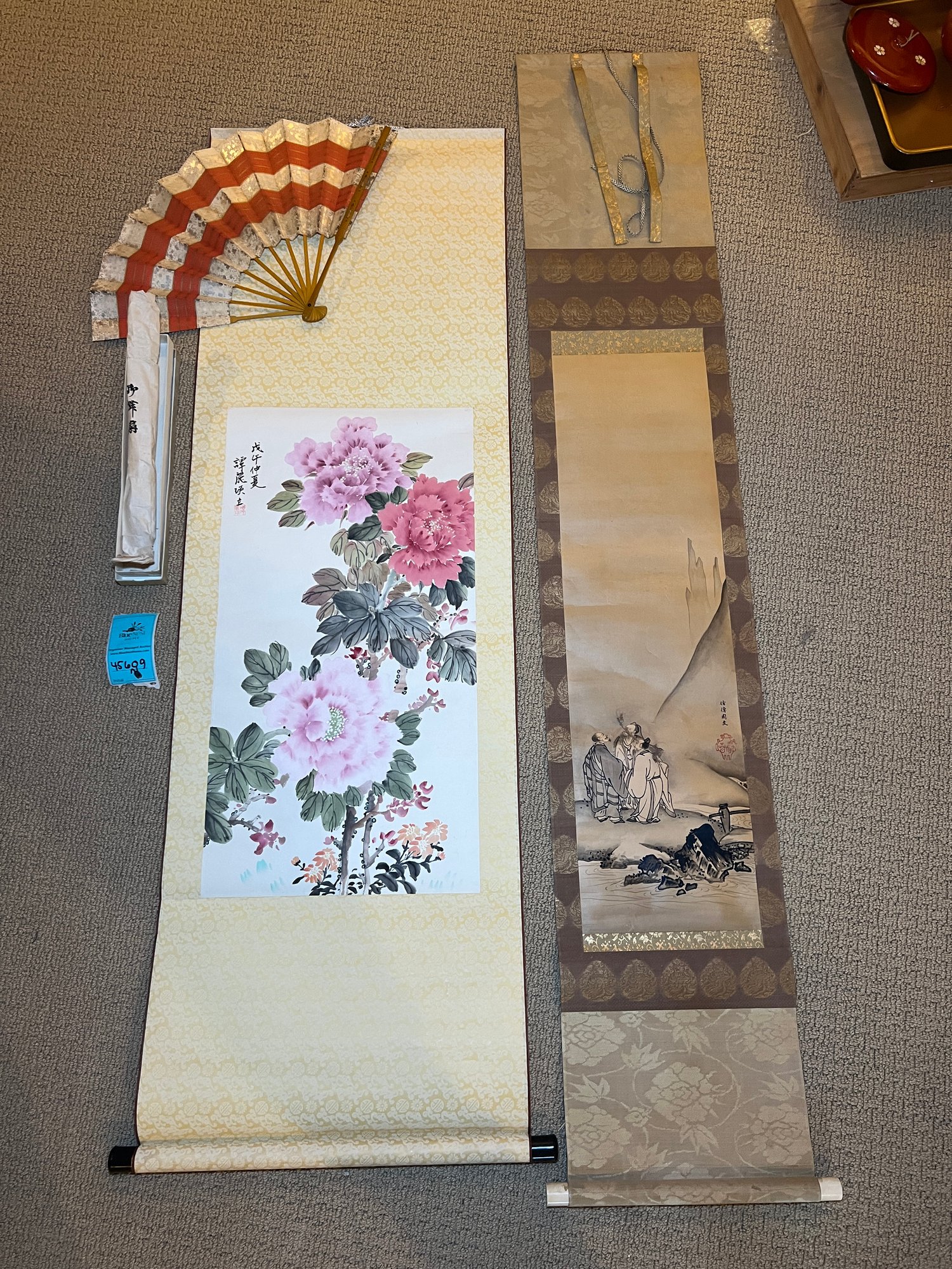 R11 Japanese Painted Scrolls. Paper Fan With Original Packaging. Flower Scroll Appears To Be Water Color Gold and brown scroll feels like it could be done on silk. Owner states brought back from Japan in 1948/49