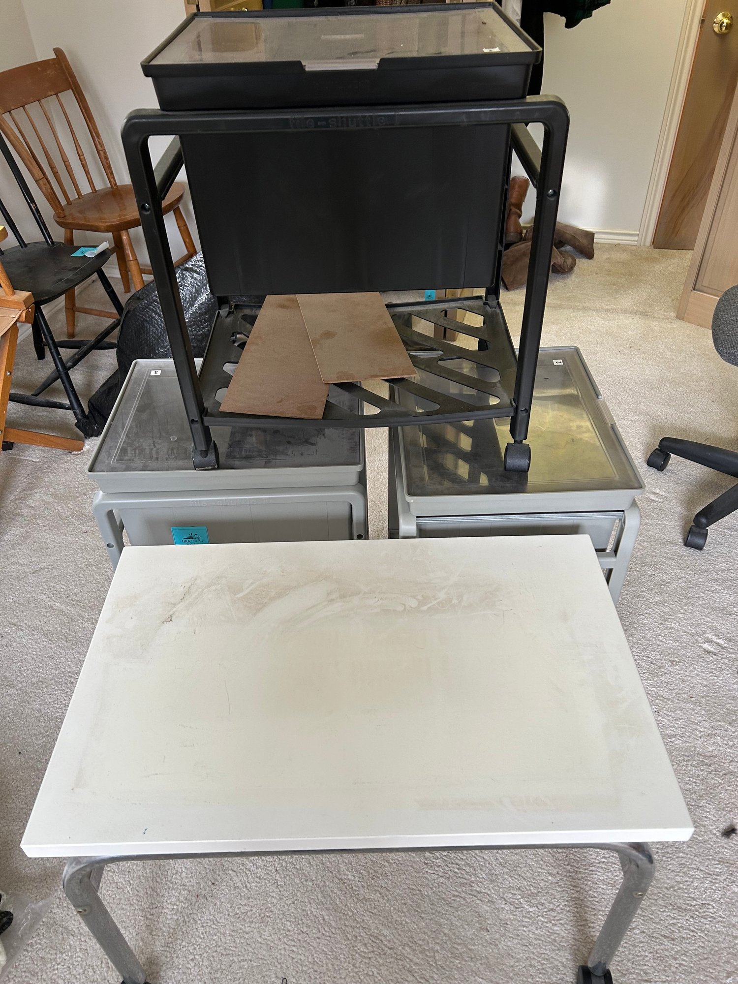 R11 Three Rolling Filling Carts, Small Rolling Table, Used Bulletin Board