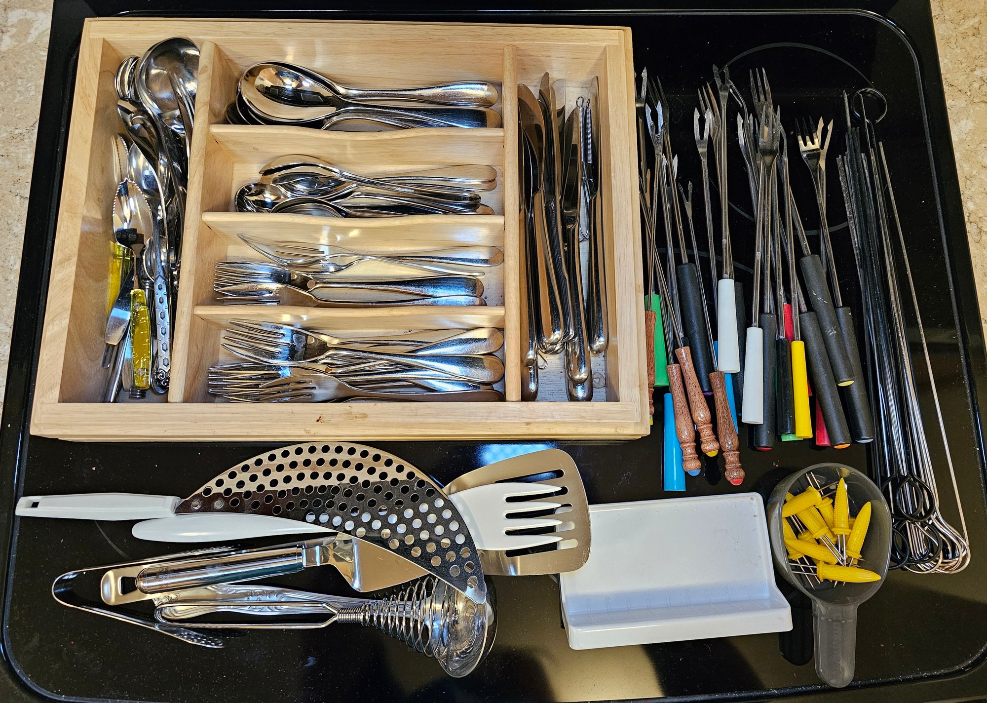 R2 Drawer Full Of Cutlery, Cutlery Organizer, Fondue Skewers, And Other Kitchen Utensils