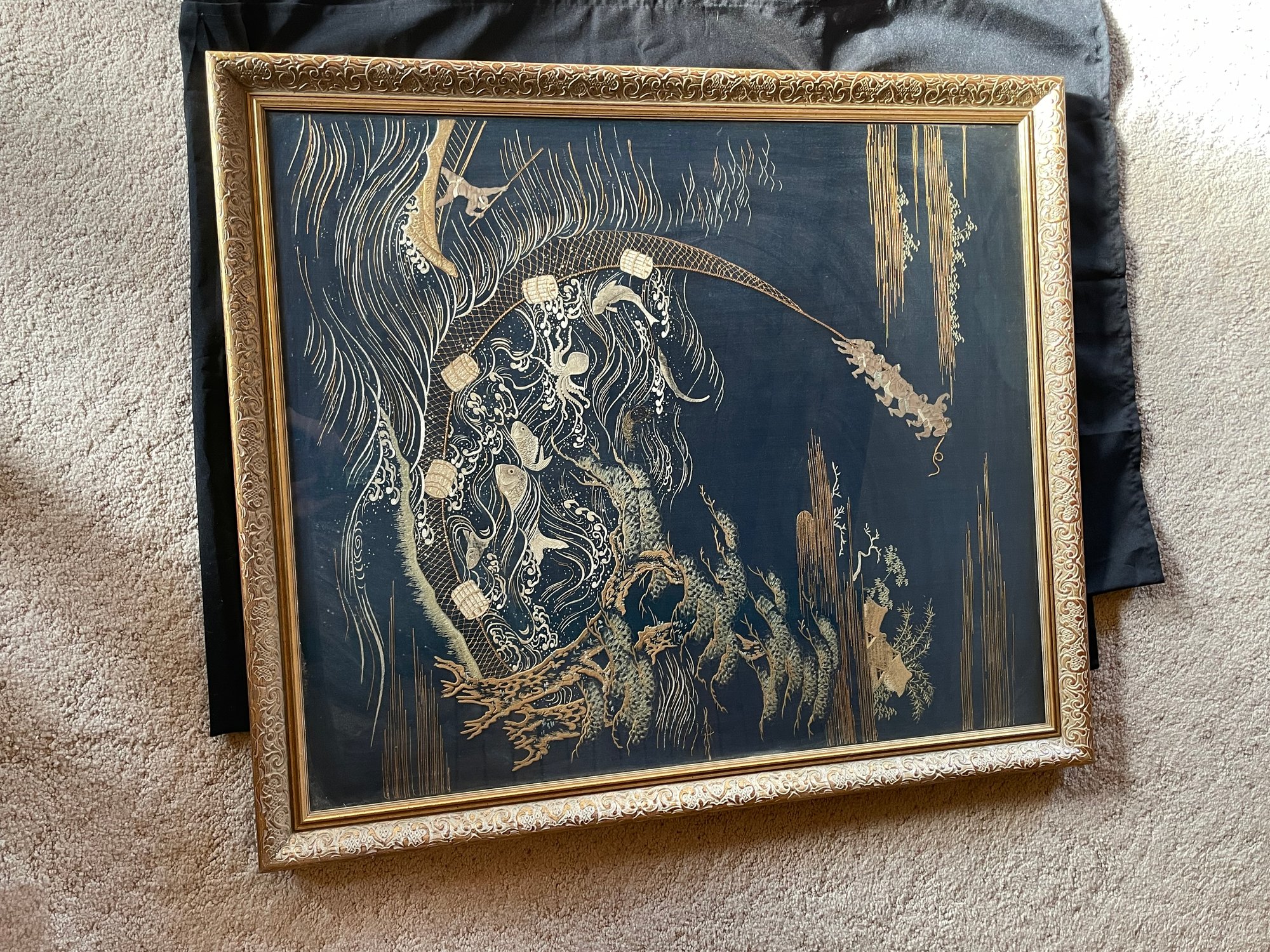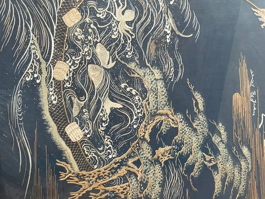 R2 Framed Silk Embroidered Wall Art. Owner Reports Purchased In Japan In 1948/49. Owner also states that under the back paper is the story of the village.