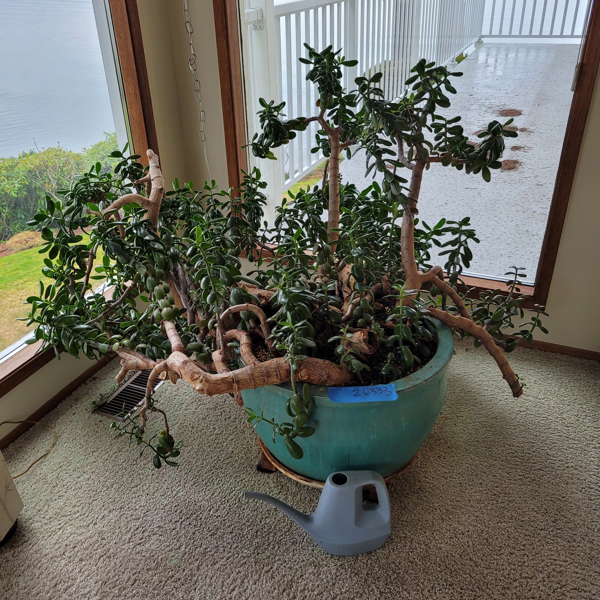 R2 Huge, Over Flowing Jade Plant In 20 Inch Diameter ceramic Pot On Wheels With Watering Can. Plant is approximately 40in at tallest point and 59in at widest point