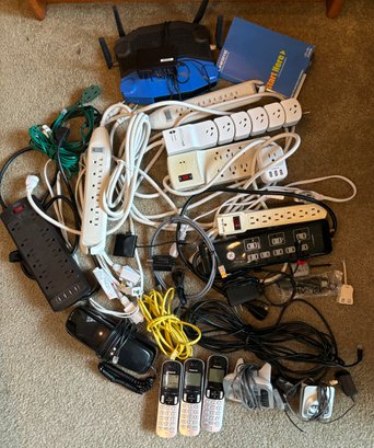 R2 Large Miscellaneous Electronics And Cord Lot To Include Linksys Set Up, Extension Cords, Landline Phones And more! Bring your own box