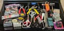 R2 Lot Of Tools, Including Scissors, Pliers, Mini Hammer, Screws, Measuring Tapes, Pocket Knives, Exacto Knife, And More.