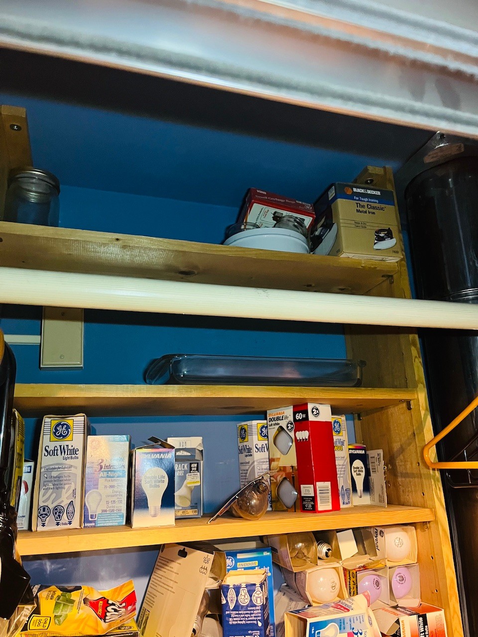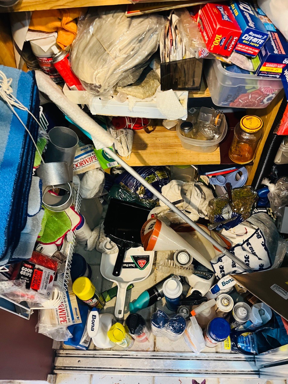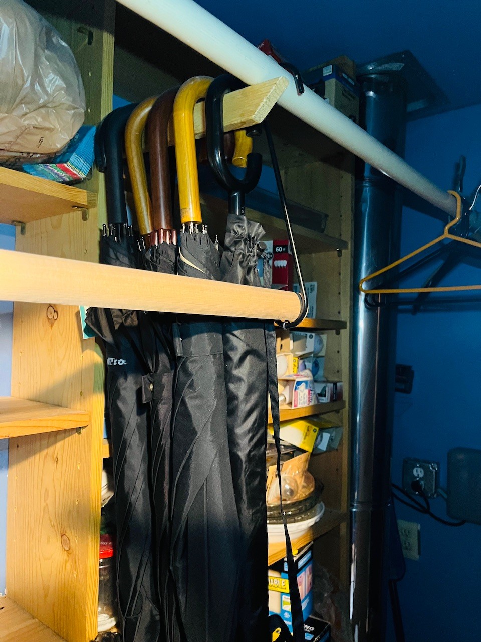 R3 Closet Full Of Home Supplies Cleaning Stuff, Light Bulbs, Step Stools, Iron, Umbrellas, Mops, Garbage Cans
