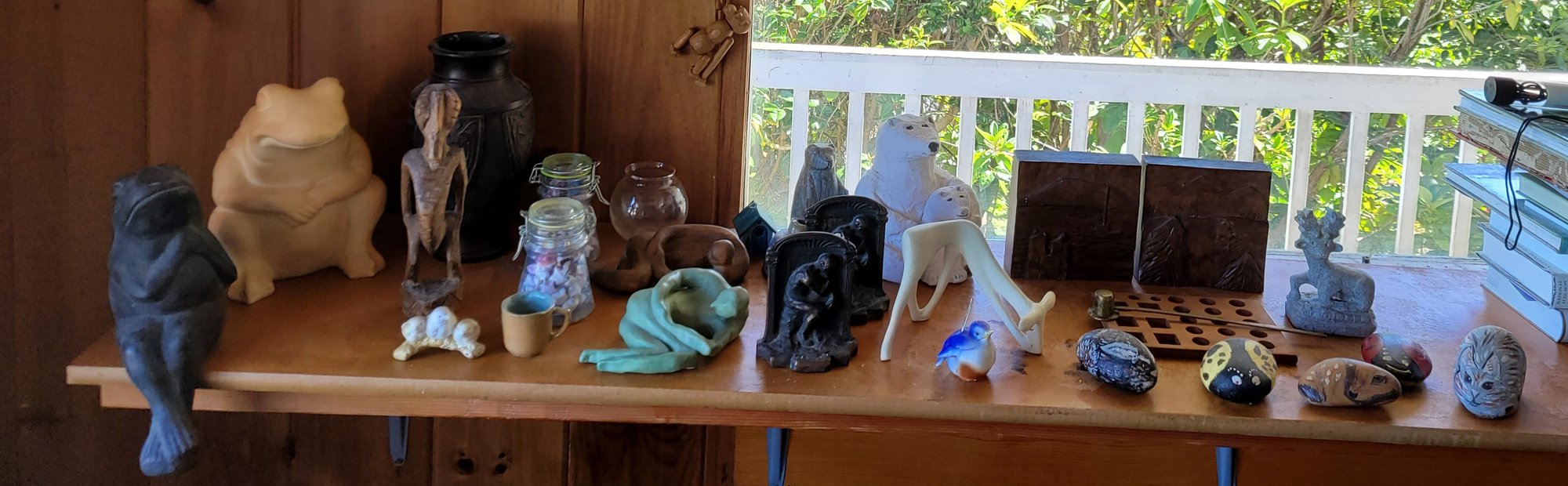 R3 Collection Of Knick Knacks Including Frog Figurines, Book Ends, Stone Bear Carving And Other Items