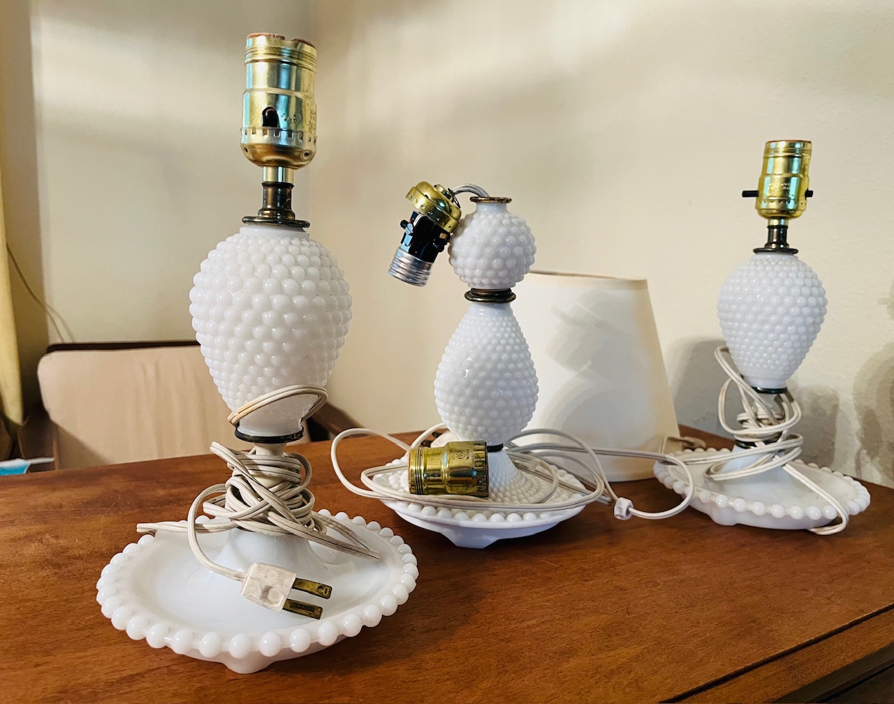 R3 Vintage White Milk Glass Electric Table Lamps w/ Trinket Bowl Bottom 11"