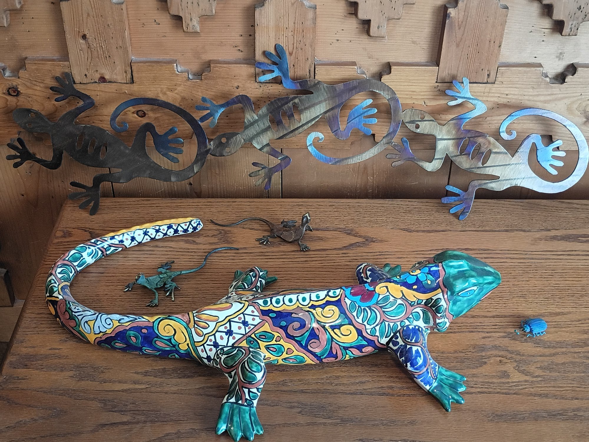 R4 Reptile Art, four pieces (two small metal gecko figurines, cut metal wall art with iridescent finish, and large painted ceramic lizard) and a cute little beetle brooch.