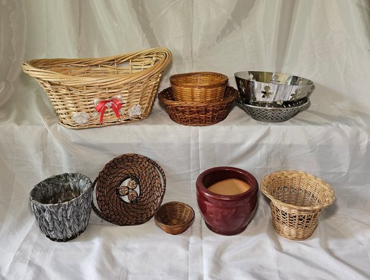 R7 Assortment Of Wicker And Metal Baskets, Flower Pots
