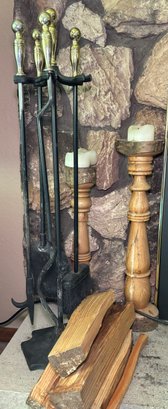 R7 Fireplace Accessories To Include Fireplace Poker, Sweeper, And Shovel, Some Wood, And Two Decorative Candle pillar holders