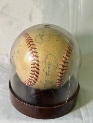 R7 Unidentified Signed Baseball In Display Jar. Possibly 1950-1960's New York Yankees Baseball. Signatures possibly include : Mickey Mantle, Casey Stengel, Elston Howard, Jerry Coleman, Andy Carey, Johnny Kucks, Don Larsen, Bob Turley, Tom Sturdivant, Hank Bauer, and several more. '