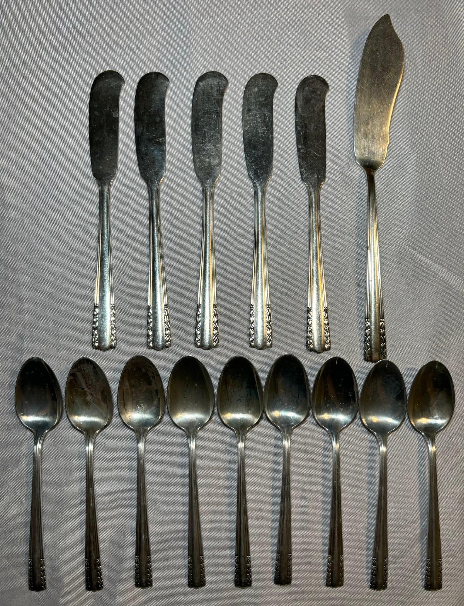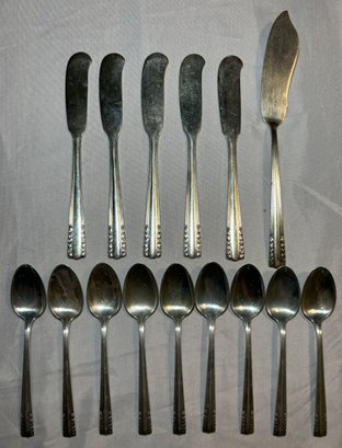 R8 Chapel Bells Sterling Nine Small Spoons, Five Cheese Knifes, And One Butter Knife