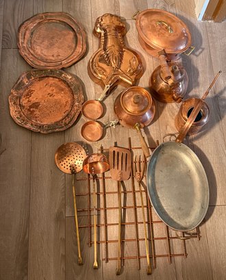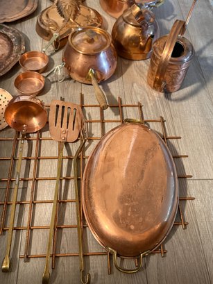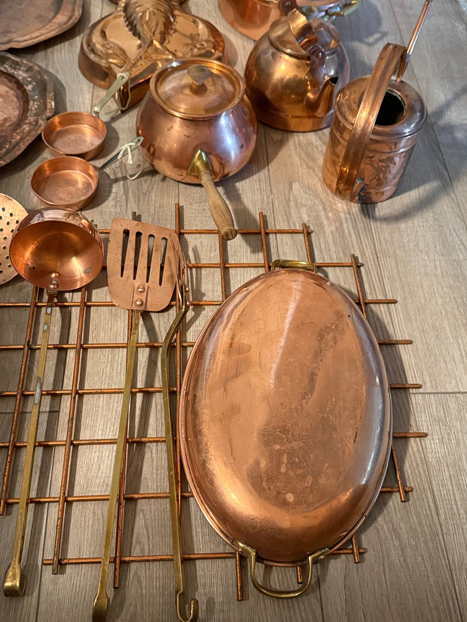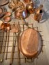 RDS Vintage Copper Items Including Cookware, Utensils, Teapot, Watering Can, and Hanging Rack. includes hooks to hang, pics not included