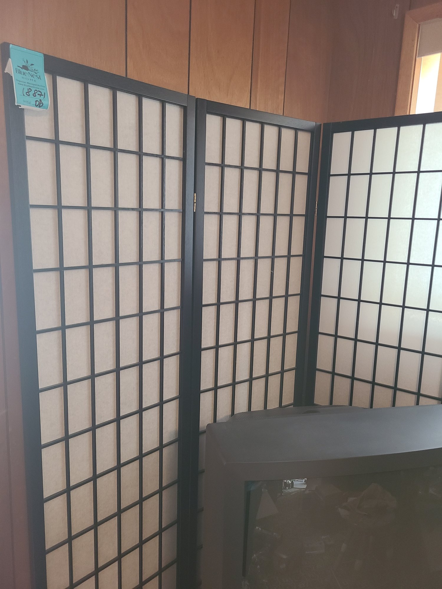 Rm8. Wood and shoji paper room divider folding 3pc. Measures about 50in x70in.
