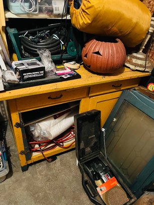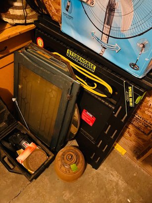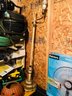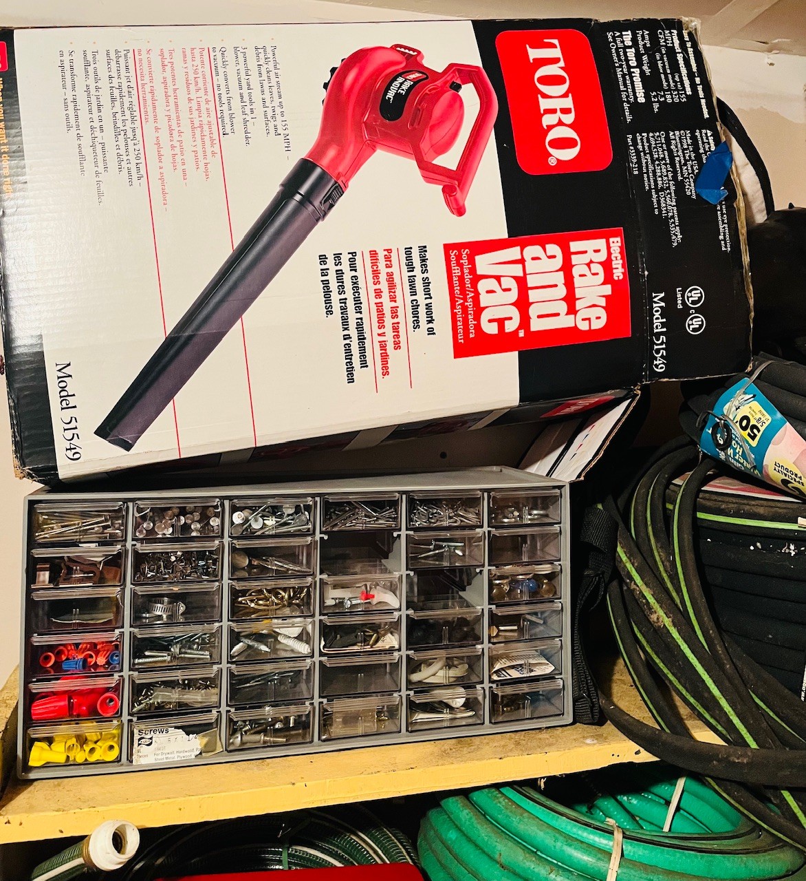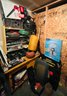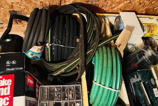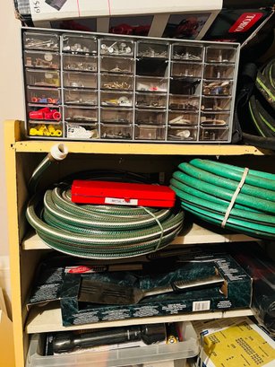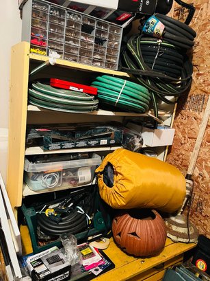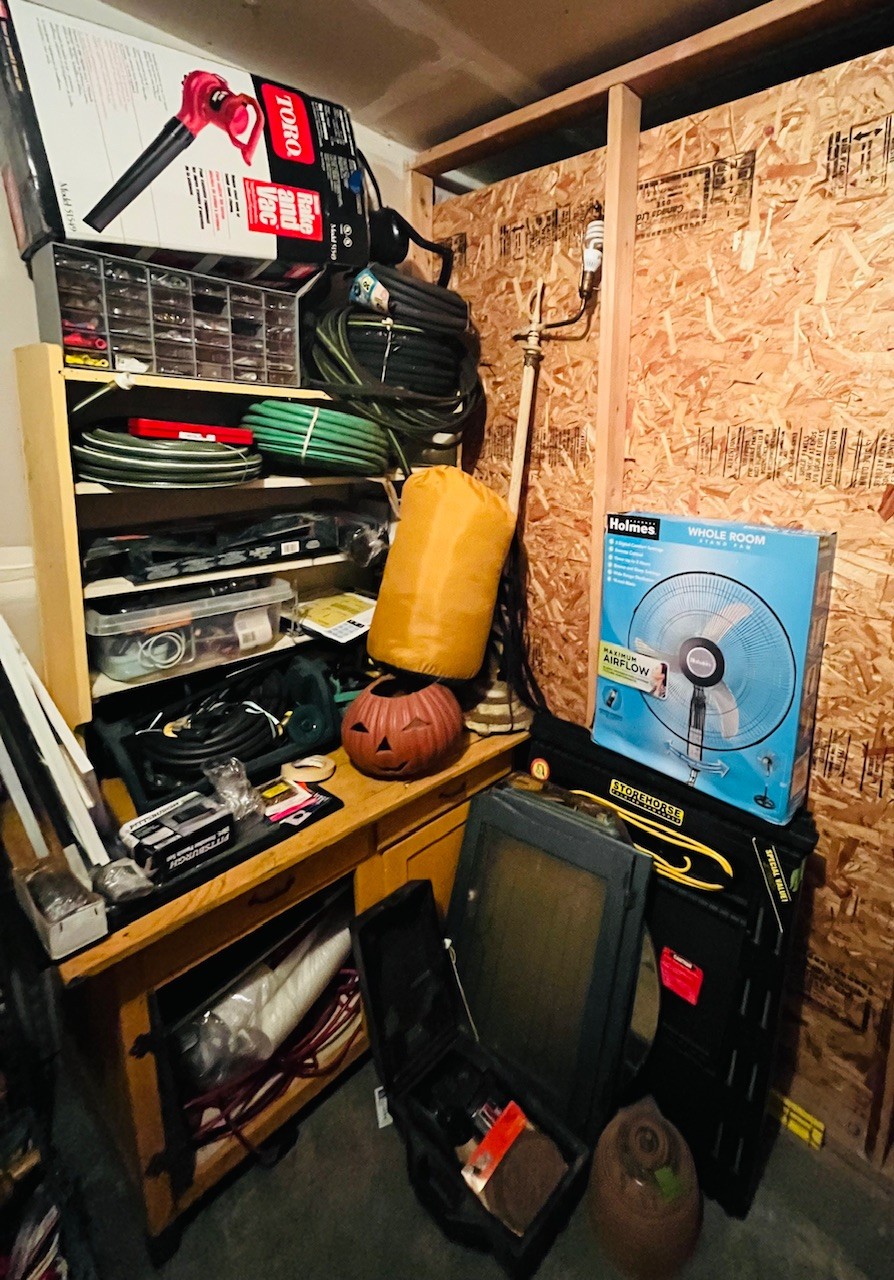 S7 Garage Shelving Unit Stacked With Tools, Toro Leaf Blower Vac, Garden Hoses, Sawhorses, Mirrors, Tv Tables
