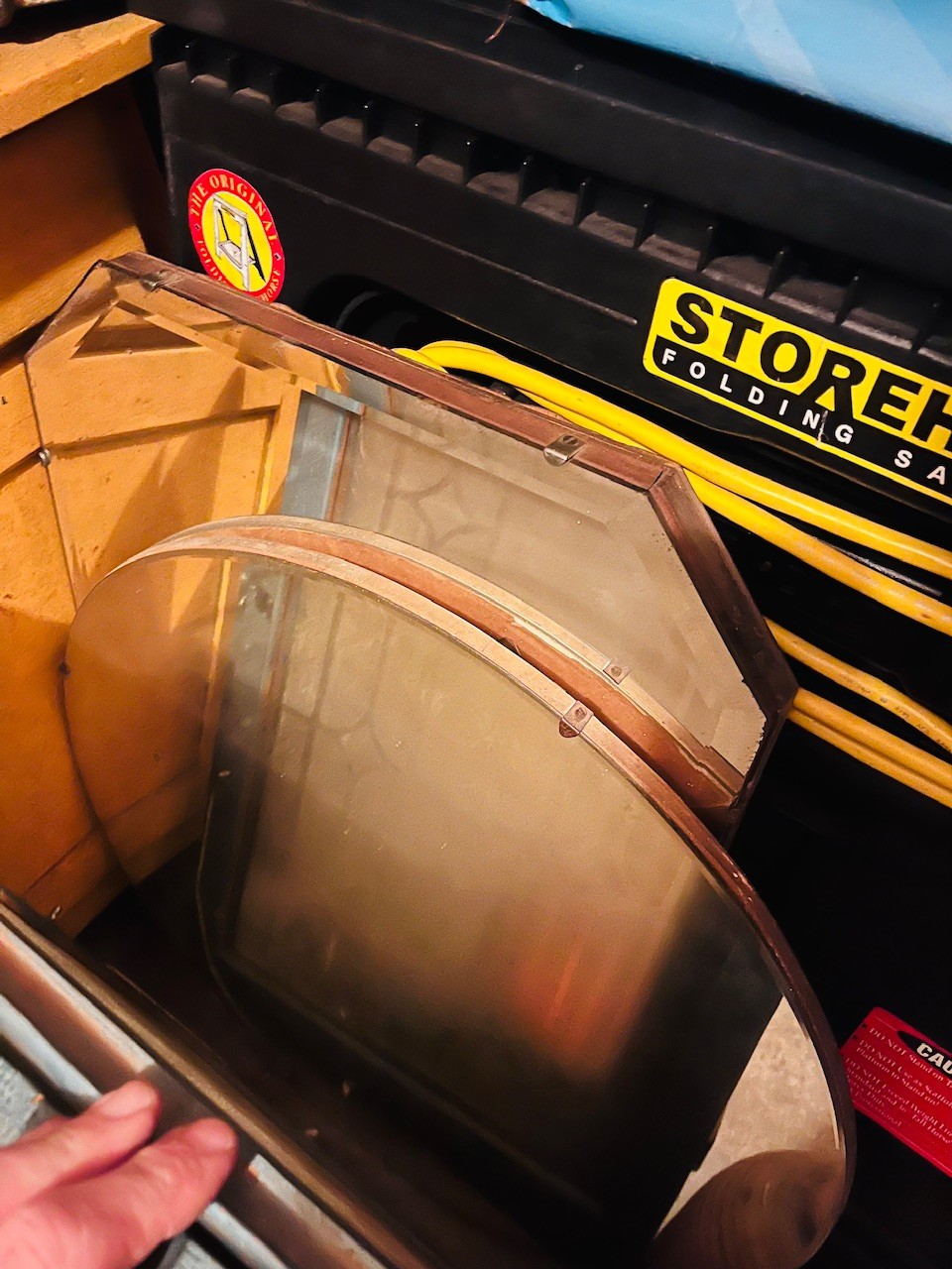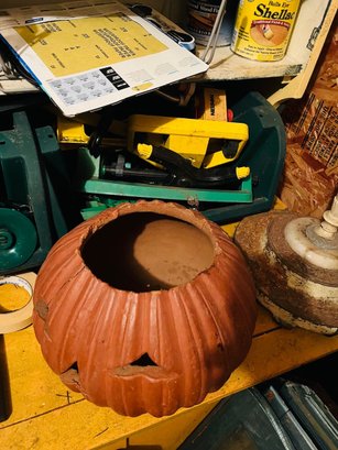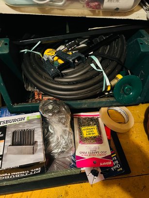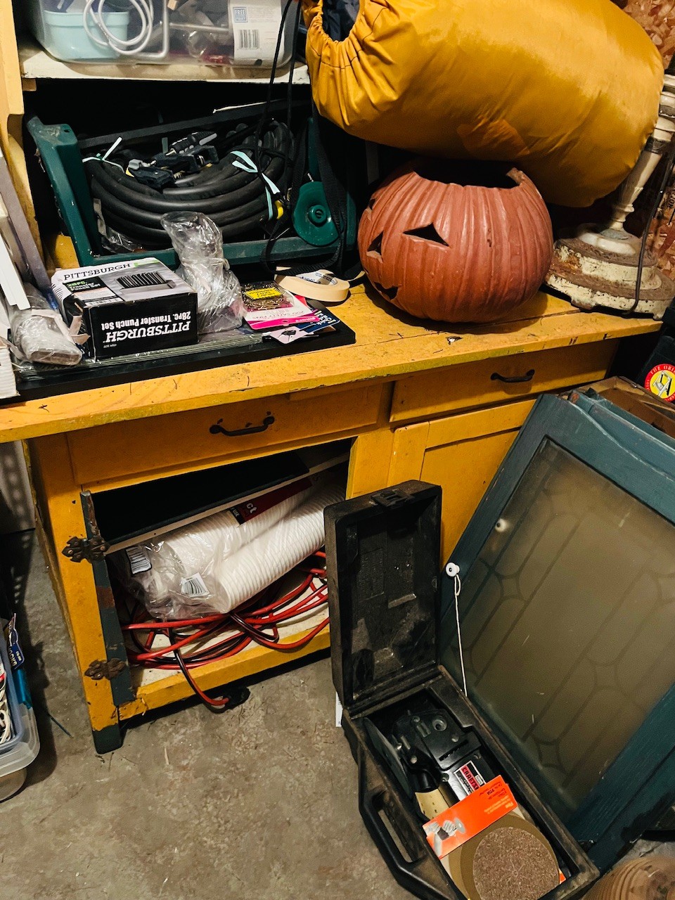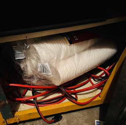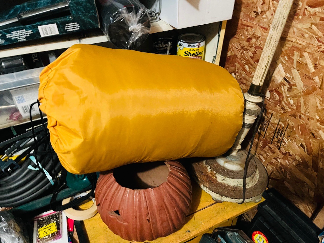 S7 Garage Shelving Unit Stacked With Tools, Toro Leaf Blower Vac, Garden Hoses, Sawhorses, Mirrors, Tv Tables