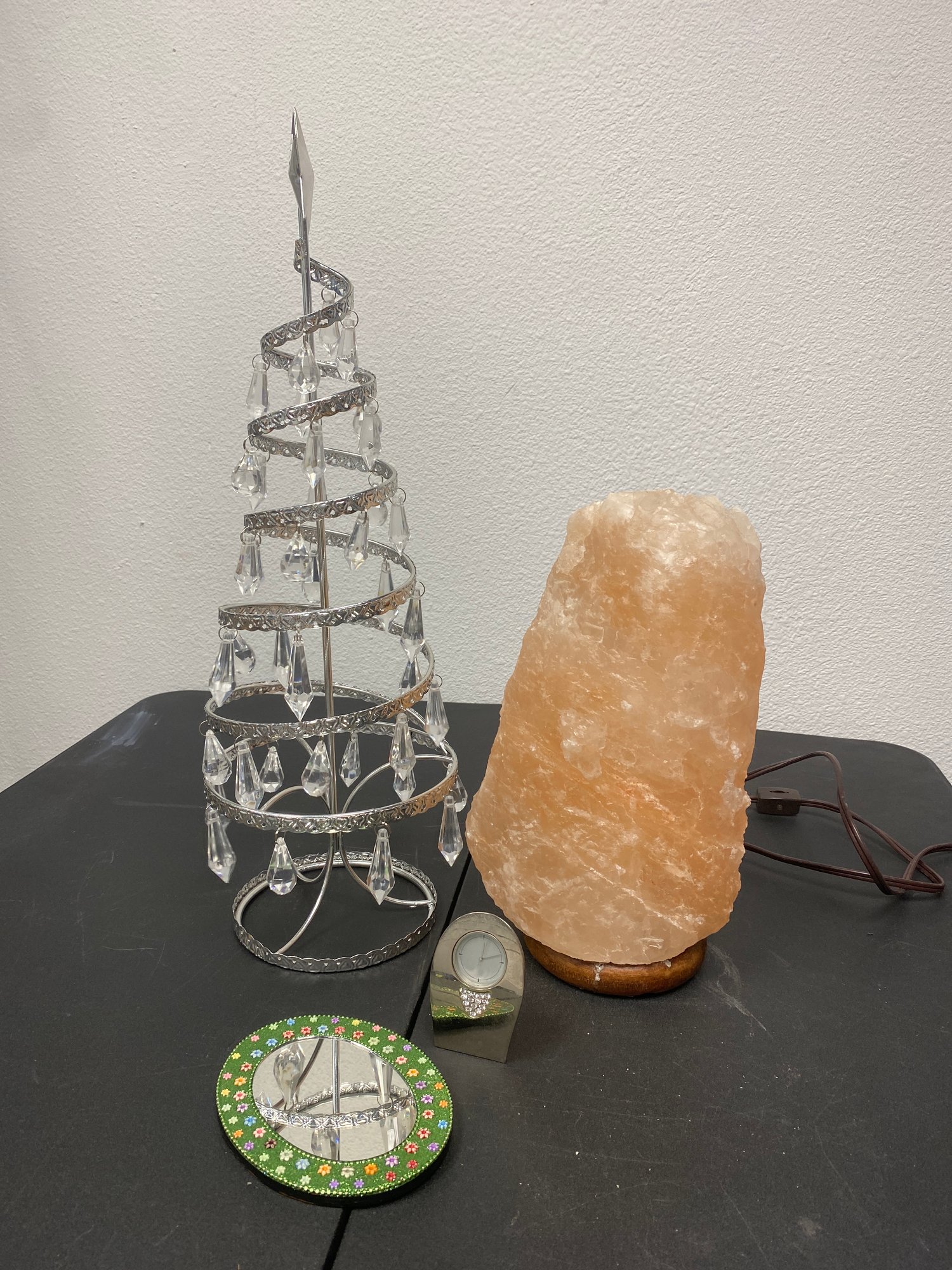Salt Lamp, Tree Decor, Clock, Mirror. Salt lamp is 13 inches tall. Tree is 29 inches tall. Clock is 3.5 inches tall. Mirror is 5.5 inches tall.