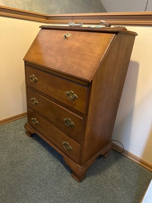 Jasper Cabinet Company Wooden secretary desk measures 27in x 17in x 38in. Also includes scissors, ruler, stapler, letter opener.