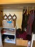 Two Tier shelf 27in x 12in x 28.5in. The lot includes bath towels and bed sheets. Women’s size leggings and pants size 8 or small. Sweaters and tops sizes unknown. Women’s slippers size 7-8. Wooden hat or scarf rack. Bring packing material. Needs cleaning. Not checked for completeness.