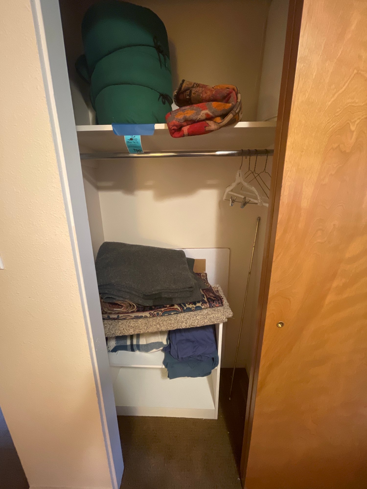 Shelving measures 25in x 12in x 30in. Miscellaneous rugs, tapestry, blanket, sheets and sleeping bag. Heavy bring help. Bring packing material.