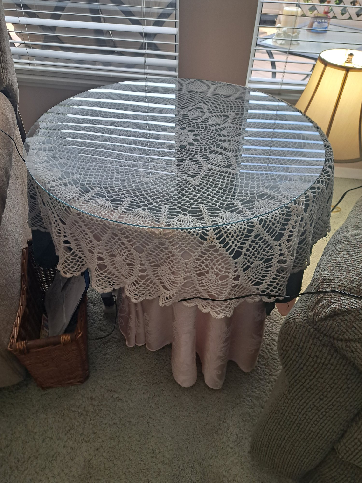 Tall Side Table With Table Cloths And Glass Topper.