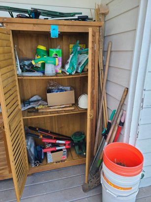Various garden tools, gloves, buckets, plant food and wood cabinet 34inx18inx63in