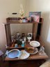 Vintage Calendar Plates, Aluminum Tray, Silverplate Bowl, Candle Holders, Silverplate Flatware Caddy, Steins. Does not include desk.