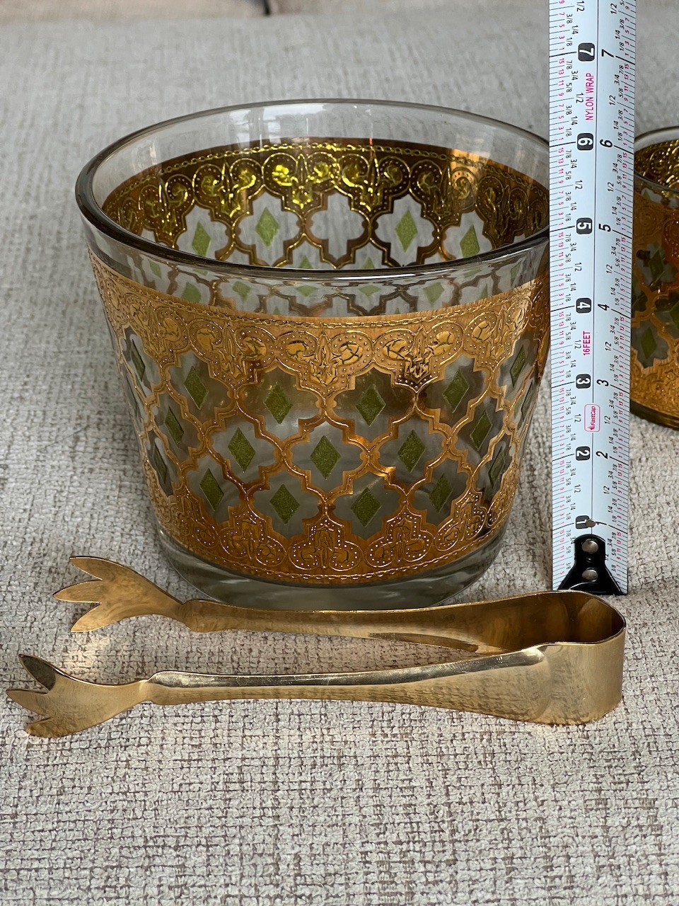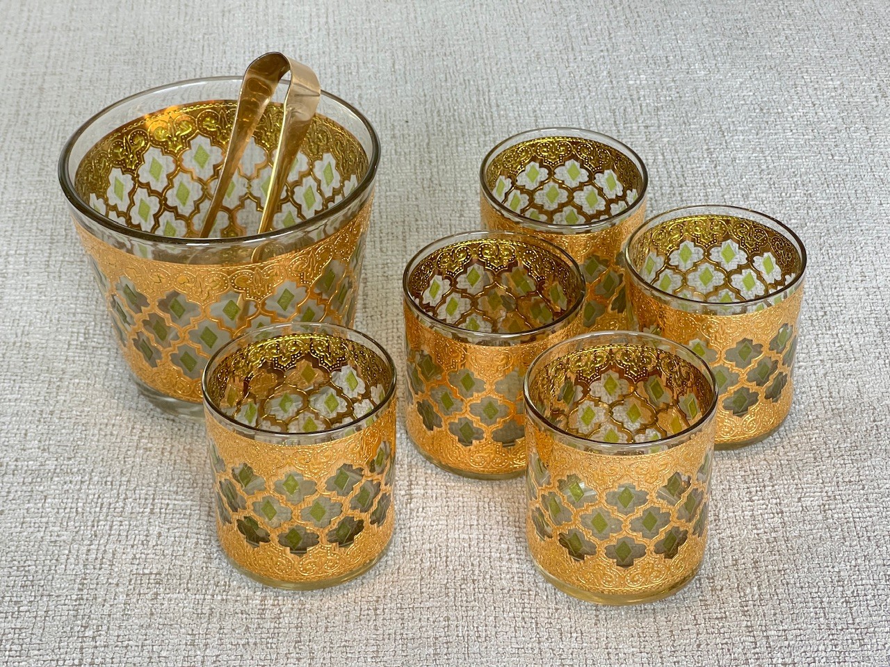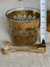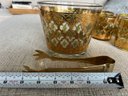 Vintage Culver Valencia Old Fashioned And Ice Bucket Set. 22kt Gold. Brass tongs.