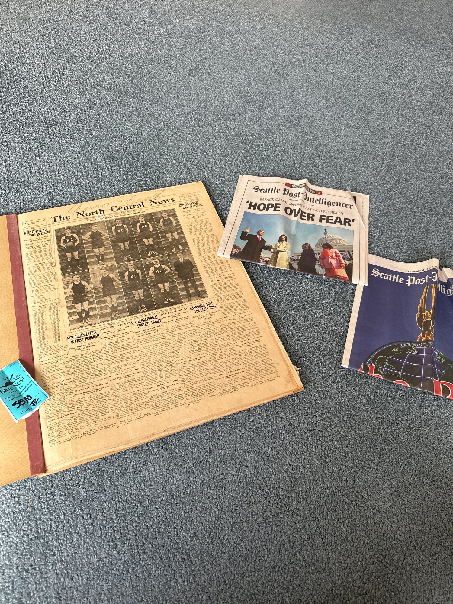 Vintage newspaper articles from 1920’s and Seattle post newspapers articles of Barack Obama takes oath as president.