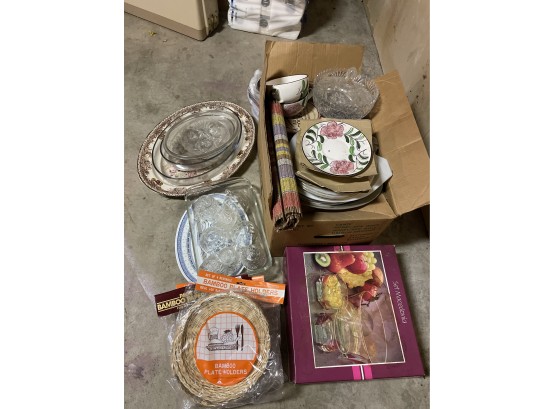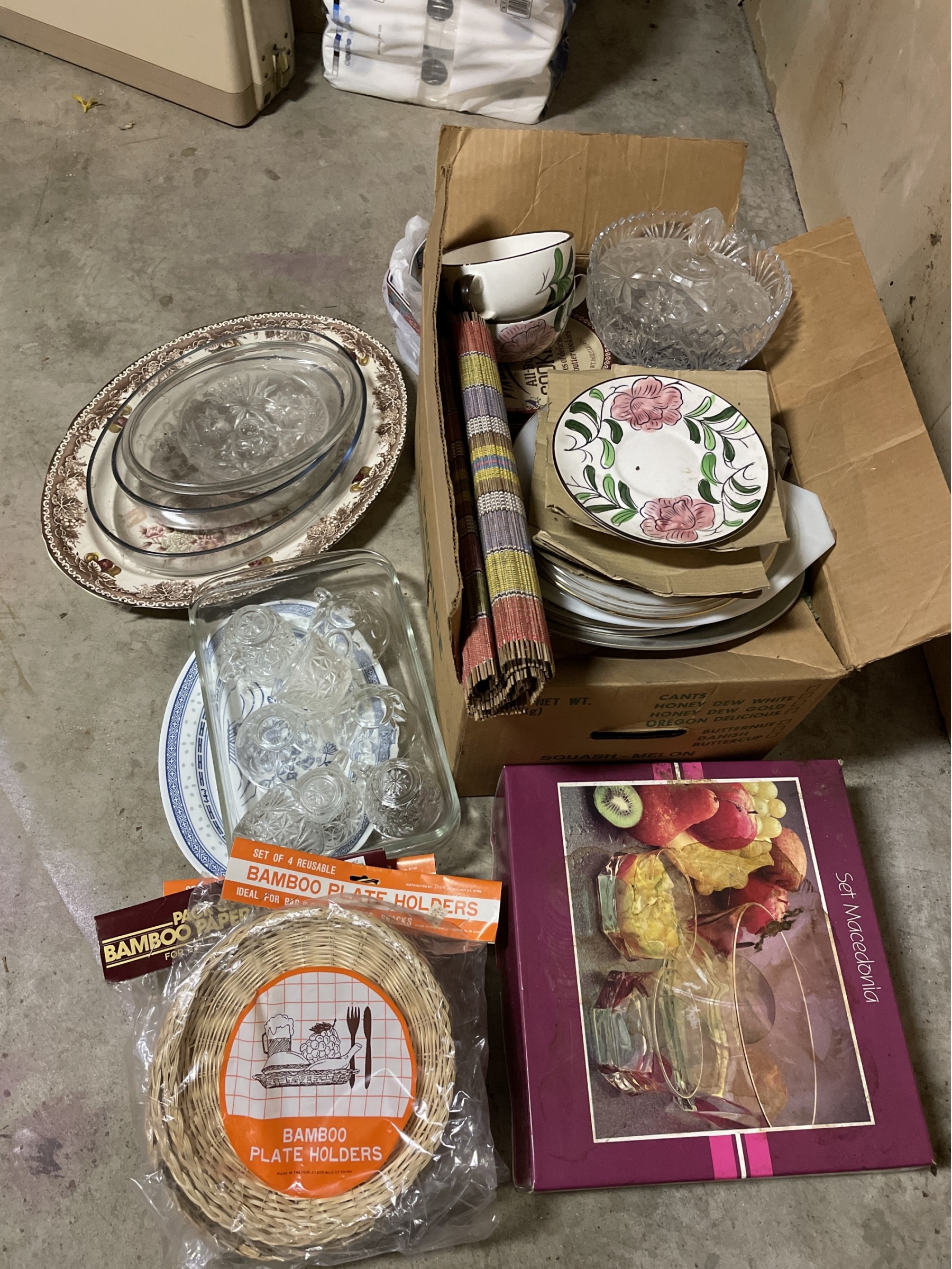 Collection of glass, bamboo, and other earthenware kitchen and serving items. Some items include: bamboo plate holders, cut glass candy dish, cut glass teacups, and more. Bring packing materials.