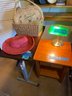 Wooden side table with drawer measures 18.5in x 18in x 22. Needs cleaning . Scratches noted. TV bed tray on wheels that measures 15in x 39.5in. 13 in tall lamp. Baskets, sun hat and wicker handbag with handle. Heavy bring help. Not checked for completeness and untested. Bring packing material.
